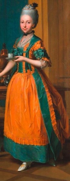 I purchased the fabric for this dress last fall, but didn't have the time to make it for our annual Georgian Picnic, so they languished in the Stash for a while. I was lucky to find them when I did, because when I went back to the same warehouse a few months later, they were both gone. But, I bought 7 yards of the orange taffeta (red/yellow shot) and 5 yards of the teal taffeta (blue/green shot), so that should be enough to pull together the entire outfit.